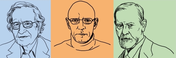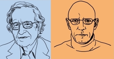 מישֶל פוּקוֹ, מהקוֹלֶז' דֶה פראנס, ונועם חוֹמסקי, מהמכון הטכנולוגי של מַסַצ'וּסֶטְס נפגשו לדיון במסגרת פרויקט הפילוסופים הבינלאומי בהנחייתו של פוֹנְס אֶלְדֶרְס. כפי שהציגם המנחה: "בין שניהם ניתן למצוא נקודות דמיון, אבל גם הבדלים. אולי הדרך הטובה ביותר להשוות ביניהם היא לראות אותם כחופרי מנהרה החוצבים משני צידיו של הר בכלים...